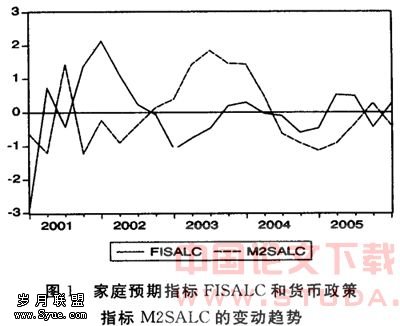 图1给出家庭预期指标FISALC和货币政策指标M2SALC的变动走势图,从图中可以看出FISALC和M2SALC的变化趋势呈明显的逆周期特征,特别是在2001年第2季度到2002年第2季度和2002年第3季度到2004年底这两段区间,两个序列变量走势的逆周期特征十分明显,这反映出货币当局及时运用货币政策工具以消除通货膨胀压力的政策意图。这是因为如果家庭对未来收入预期增加,则根据消费的欧拉方程,消费支出和消费性贷款将增加,经济中的通货膨胀压力加大,则钉住通货膨胀的货币当局应采用紧缩性货币政策降低家庭收入预期以消除经济中的通货膨胀压力。
