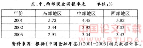 通过调整法定存款准备金率,中央银行能够调节货币乘数和货币供应量。根据西方传统的教科书理论,如果通货记为C,支票存款记为D,银行持有的超额储备率,记为ER,联储决定的法定存款准备金率记为rd, 则货币乘数m=(1+C/D)/(rd+ ER/D+C/D),其中C/D为通货比率。显然,货币乘数不仅取决于法定存款准备金率rd的大小,还取决于通货比率C/D的大小,这里的通货比率相当于我国货币理论界所称的现金漏损率(可用流通中现金与企业活期存款之比表示),由于数据取得的困难,不妨用现金投放代替流通中现金,用企业存款代替企业活期存款,则东、中、西部的现金漏损率见下表。