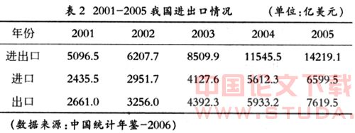 当一国的国际收入大于支出时,即表现为国际收支顺差。在外汇市场上,国际收支顺差表现为外币的供应大于需求,从而形成顺差,使本国货币汇率上升。2006年我国国际收支经常项目顺差2498.66亿美元,资本和项目顺差100.37亿美元(近年有走低趋势);2001年以来我国进出口总额也是持续高位增长(见表2),截止2007年5月我国进出口总额超过940.6亿美元,国际收支顺差和进出口总额增长,会造成人民币汇率上升。而且中国对美国的贸易连年顺差,但美国经济由于国内和国外的原因,迟迟难以摆脱低迷的境况。在这种情况下,美国政府放弃以往实行的强势美元政策,要求其主要的贸易国的货币升值,而美国是中国第二大贸易伙伴国,当然人民币升值问题就成了美国的政策目标。