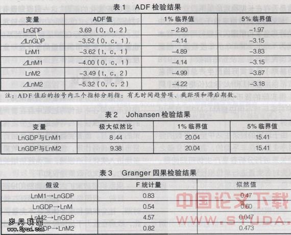 由表2可看出,8.44<15.41, 9.38<15.41,这说明在5%的显著性水平下,两者均接受原假设,即无论是广义货币供应量还是狭义货币供应量与国民生产总值之间都不存在长期稳定的关系,也就是说货币供应量增加通过银行信贷和资本市场传导对实体经济的增长效果不显著。