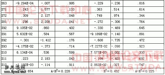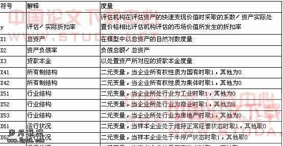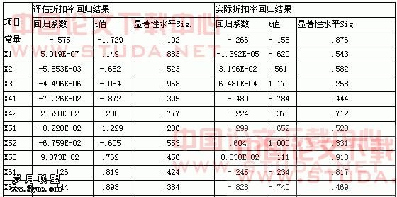 解释变量中没有显著性因素存在。也就是说,在可获得资料的前提下,对实际折扣率的高低没有较强说服力的变量.进一步或许可以说,在我们假定市场有效的前提下,或者是评估机构对资产的市场价值的评估不准确,或者是不同资产项目的非市场价值具有不确定性和多变性,没有统一可寻。