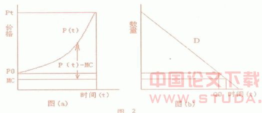 在图(2)(a)图中,横轴表示时间,纵轴表示资源价格和边际成本。(b)图中横轴表示时间,纵轴表示数量,D为耗竭性资源的需求线。在(a)图中,资源的初始价格为P0,稀缺成本或资源补偿费为P0-MC,即初始价格减边际成本(这里假定边际成本为常数MC)。随着时间变化,稀缺成本将以实际收益 ,或市场利率的速度R 上升。与此同时,资源的价格P也随之上升,最后达到时间t时,资源全部开采完毕,此时的终止价格为Pt。