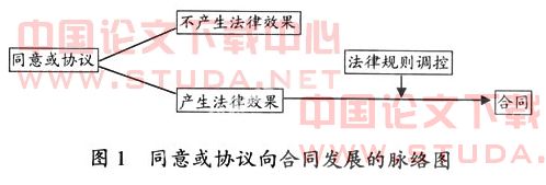 关于行政合同的法律概念,不妨通过与私法合同相比较的视角来界定。在法国法中,合同概念由民法予以规定。民法典第一千三百四十四条对合同概念做了规定,即合同是关于自身强制性义务的协议,这是被所有法律部门公认的概念。莱昂·狄冀就说过,公法与私法中的合同概念统一,且其效果也相同[1]。这一概念的要素在于:协议或同意。协议或同意是一种事实上的状况,当这种事实产生一定的权利或义务时即构成了法律意义上的合同。可见,合同必然是同意或协议,但同意或协议并不必然是合同。我们可以将同意或协议发展为合同的脉络做一简单图示(见图1):