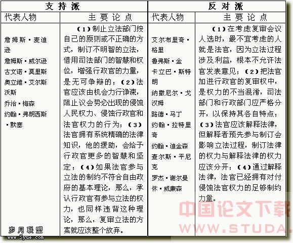 那场辩论预演的主角是坚定的事前司法审查反对派、马萨诸塞代表格里先生。6月4日与会代表开始讨论弗吉尼亚方案(The Virginia Plan)第八项第一个分句即设立“复决会议”时[25],格里第一个明确表示怀疑司法部门的成员是否应该进入这个会议。其理由是,“通过解释法律,法官已经拥有对付侵蚀法官权力的足够制约力量,解释法律涉及判断立法是符合宪法还是违宪……让法官对涉及公共政策的措施作出判断,与法官职务的本质不相容。”[26]在后来的三场辩论中,格里始终坚持这种立场不动摇,而且他的以上反对理由亦堪称是反对派历次辩论的基调。综合分析他们的辩论发言,我们可将支持与反对的双方阵营及其主要论点简要列表如下: