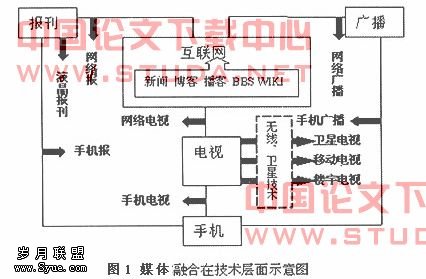 图1为传统媒体与新媒体之间在技术层面融合的示意图,传统媒体报刊、广播、电视在与新媒体互联网、手机融合中形成了网络报、手机报、网络广播、手机广播、网络电视、手机电视,再加上无线、卫星、液晶等新数字技术的应用又有了卫星电视、移动电视、楼宇电视、液晶报刊等新型融合媒体。