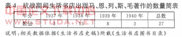 表4所统计的,仅仅是马恩列斯毛五人的直接著作,还不包括他其他马列主义书籍。从中不难看出,由于武汉抗战时期相对宽松的环境,尤其是生活书店积极的进步姿态,使得在武汉时期相关书籍得到集中出版。这其中,最广为人知的诸如《共产党宣言》、马克思的《资本论》、毛泽东的《论持久战》等,都是在武汉抗战时期的汉口生活书店出版的。