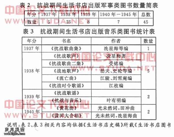 这一时期的生活书店不仅新书出版数目众多,而且书籍内容明显侧重战时需要。如表三中所列的抗战期间生活书店出版的音乐类图书,无一例外都是抗战题材。这一时期,汉口生活书店不仅继续出版原有的“救亡文丛”、“世界知识丛书战时丛刊”、“黑白丛书战时丛刊”和“战时大众知识丛书”等战时图书系列,还在汉口新创立了“战时社会丛书”、“问题与答案丛刊”、“抗战中的中国丛刊”和“西北战地服务团丛书”等等。这些书刊都是应抗战实际情况而特别编写的战时读物。