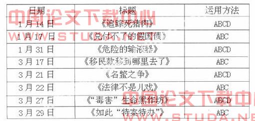 我们以《焦点访谈》2002年1-3月播出的调查性报道为例,看这些节目中运用了几种采访方法。注:A代表搜集资料;B代表访问;C代表观察;D代表体验感受。