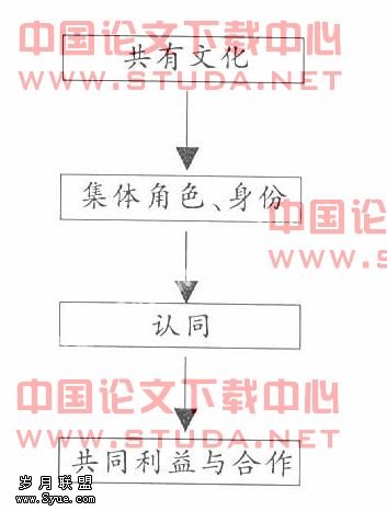 那么什么是观念?建构主义的观念是个集体性概念,即是共有观念(shared ideas),而不是个体中存在的各不相同的观年,这种观念是主体间共识(intersubjective understandings),是共有的文化、共有的知识、共有的期望、共有的理解等。而身份的确定是由社会/群体的文化以及自身的观念建构而成的,并形成一种集体认同,从而最终影响自身作出的决定及行为。温特认为,集体身份(collective identity)把自我和他者的关系引向其逻辑得出的结论,即认同(identification)。认同是一个认知过程,在这一过程中自我与他者的界限变得模糊起来,并在交界处产生完全的超越。自我被“归入”他者。集体身份则是角色和类属身份的独特结合。而“角色身份(又)依赖于文化”,“存在于和他者的关系之中”。上述这种关系若用一个图线谱来表示就是: