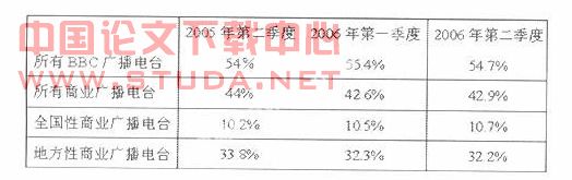 广播是英国日间最受欢迎的媒体,以下是RAJAR 2006年8月3日发布的关于英国广播电台最新的收听市场份额数据:⑥