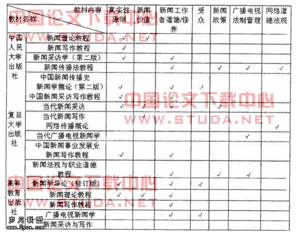 但是笔者遗憾地发现,在新闻学教材存在课程内容部分重复的现象。现以人民大学出版社、复旦大学出版社、高等教育出版社等新闻学权威出版社的教材为例,统计如下(表中划√说明该教材包含相应内容):