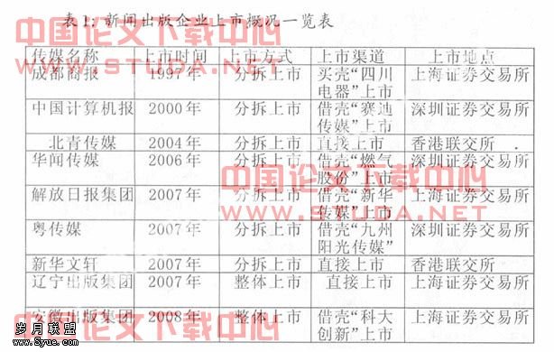 从新闻出版企业上市的实践来看,由于我国绝大多数传媒企业实行的是“事业单位企业化运作”,囿于外部管制因素的影响,绝大多数传媒企业尚未成为真正的市场主体,也未建立起合理的企业制度。因而在其上市之前,必须进行改制,按照规范化公司的运作要求对其进行股份制改造,重塑市场主体。由于自身基础条件不同,传媒改制后的效果也大相径庭。基于自身状况和其他各种因素的考虑,那些上市指标暂时不能满足证券市场门槛要求的传媒企业,便选择了“迂回战术”,通过借壳或买壳的方式实现间接上市。如1999年《成都商报》买壳四川电器上市,2007年解放日报报业集团借壳新华传媒上市。而那些在改制后能达到证券市场直接上市指标要求的,进一步视自身业务状况,有的选择在主板市场上市,有的则在二板市场上市,例如,作为中国最大出版商之一的辽宁出版集团,是我国出版业第一家完全政企分开、政事分开,最先完成股份制改造的出版产业集团,由于其自身经营业绩表现良好,因而在13家新闻出版集团角逐首轮IPO的竞争中脱颖而出,成功在上海证券交易所上市。另外,还有一部分有好的概念或盈利模式,则选择在境外上市,如新华文轩选择在香港直接上市,而新浪等新闻门户网站则直接登陆美国纳斯达克市场。