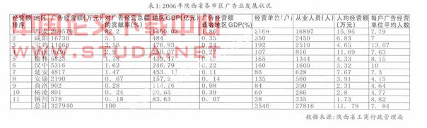 同时,从属于生产性服务业的广告产业所服务的对象来看,除了极少数的个人广告业务以外,绝大多数的广告营业收入来自于企业,尤其是为制造业企业提供专业化的服务。从2006年陕西省广告产业的区域布局情况看,全省82.2%的广告经营额、61.17%的广告经营单位、60.75%的广告从业人员集中在省会西安市(如表l所示)。陕西省的广告产业向经济发达城市集中的格局,正是由于西安市集中了陕西广告产业发展所需要的绝大多数大客户、省级媒介资源和高素质的专业人才。同时也造就了陕西全省广告市场的极大地不平衡性。