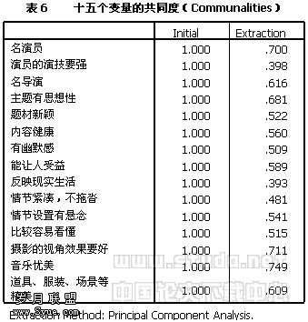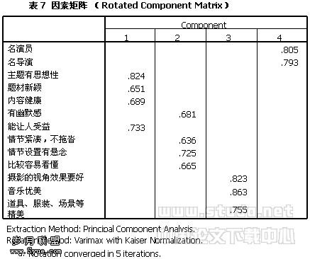 第三,对调查数据进行因素分析发现,“演员的演技要强”和“反映现实生活”两个变量的共同度低于可接受水平,分别只有0.398和0.393(参见下表5);并且在因素负荷矩阵中,两个变量分别在两个因子中的负荷值都在0.4左右。本研究的量表建构将这两个变量删除。