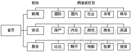 下面来分析一下板块制架构。由于新闻网站的频道一般都在10个以上,有的多达40多个,而网站的内容从大类上讲,则只有3-5个类别,在这种情况下,不妨在“频道”的概念之上再加一个“板块”的概念,即把一个大类定位为一个版块,如果某新闻网站共有四个大类,则整个网站的导航区域里就分为四大板块。
