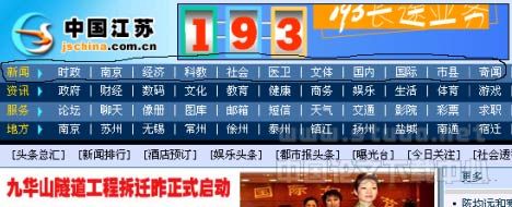 中国江苏网2004年4月新改版的首页就采用了板块制(图8)。它的导航区域设有“新闻”、“资讯”、“服务”和“地方”四大版块,一下子就把新闻频道从原来在导航区域内只占十几分之一提高到了四分之一的地位。在这种版块制架构里,新闻频道里的一极栏目,如“时政”、“南京”、“”、“科教”、“社会”等栏目,原来的地位是低于资讯类众多频道的地位的,在首页上看不见,现在却与它们“平起平坐”,可以从首页一步点入。