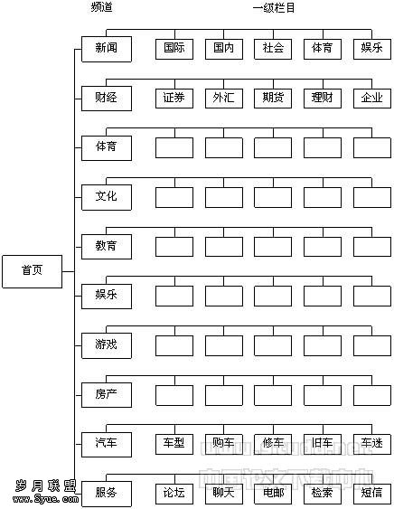 新闻网站导航区域的布局与架构,存在着两种基本的类型。一类称之为频道制架构(图5),另一类称之为板块制架构(图6)。