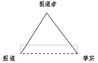 新闻报道与客观事实的这种间接关系也可以通过奥格登和李察兹的语义三角形得到进一步说明。在奥、李看,符号与所指对象之间不存在直接关系,所指对象通过概念为主体所接受,主体通过符号来表达概念。如果我们把语义三角形中的符号、主体(概念)和所指替换成报道、报道者和事实,其间的关系就非常清楚了: