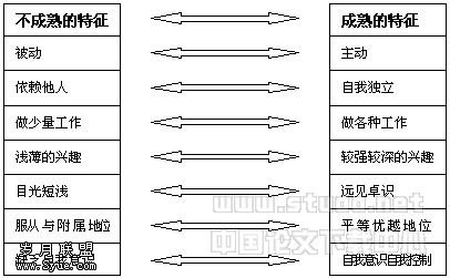 阿吉累斯认为,社会现实的管理制度压抑着人们在人格上成熟。健康的人从婴儿到成人,在心理上有一从不成熟向成熟发展的自然过程。在这个过程中,人格要发生七种变化。如图: