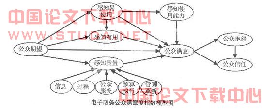 该模型以公众满意为中心将公众满意的前因后果构成一个系统性的网络链条,共有公众期望、感知质量、信息、过程、公众服务、预算执行、管理革新、感知易使用、感知有用、感知使用能力、公众满意、公众抱怨和公众信任共13个变量。