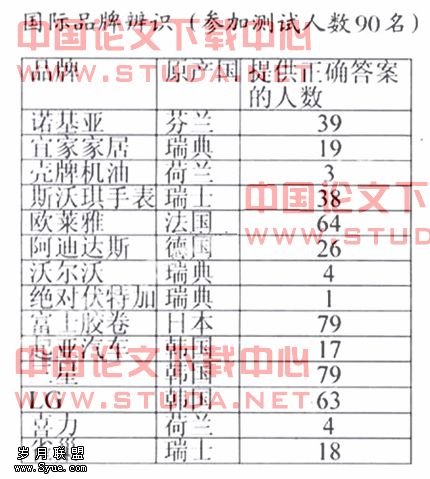 为了对品牌形象有较全面的认识,我们尝试对品牌认知与原产国是否具有相关性这个问题进行了探讨,即特定的品牌是否与特定的国家相关联。我们随机对90位在校大学生进行测试。为他们提供了一份任意14个著名品牌的名单,让他们指出该品牌的原产国。这份名单包括耐克、壳牌机油、沃尔沃汽车、雀巢食品等中国学生熟悉的国际品牌,测试人的回答是在设定时间内完成的。我们按照测试的目的——观察特定的品牌是否与特定的国家相关联,并对测试结果进行整理。回收有效问卷87份,整理结果详见下表。