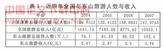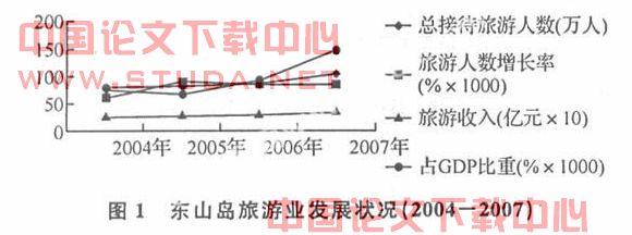 东山岛是全国第六、福建省第二大海岛县,旅游资源丰富,资源得天独厚,气候宜人、冬暖夏凉,终年无霜,年平均气温20.8℃,岛上绿树成荫,绿化率达95.4%,素有“东海绿洲”、“东海明珠”之美称。在我国六大类74种旅游资源中,东山岛具备全部6大类和其中的48种。在假日的推动下,休闲旅游成为东山县的一大特色,海峡两岸(福建东山)关帝文化旅游节的成功举办又给东山旅游业注入新的活力。近四年来东山的总接待旅游人数增长很多,旅游收入也是逐年上涨,可是上涨幅度不是很大。如图1所示。