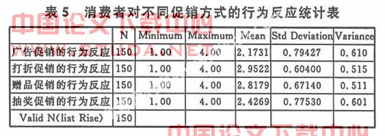 为了了解W公司的顾客群体对公司采取的促销方式的偏好情况和关注程度,我们对购买者的反应和态度数据进行了描述性统计分析,通过SPSS12.0的统计分析结果如表5所示: