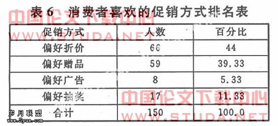 另外,为了进一步的了解公司的顾客对促销方式的偏好,我们要求调查对象直接选择她们喜爱的促销方式。并整理如表6所示: