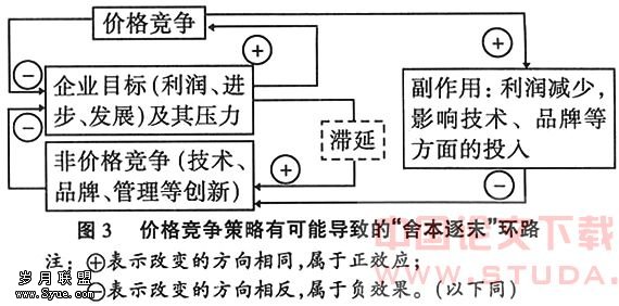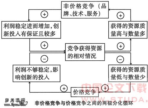 2.非价格竞争已成为提高效益的主流手段。鉴于在运用非价格竞争策略的企业及行业与运用价格竞争策略的企业及行业之间展开竞争时,两者将有可能进入一个日益分化的循环当中(如图7),因此,面对非价格竞争已经成为国际市场竞争主流的情况,我国钢铁行业亦不应例外。