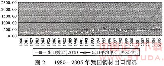 (二)主要依靠价格竞争手段,削弱了企业发展后劲,并在一定意义上陷入不良循环。在产品的非价格因素不具有优势的情况下,营销组合的价格策略即低价几乎具有唯一性。反之,则可以有多种选择,而目的都是如何实现利润最大化。一般而言,各先进产钢国家或地区凭借产品结构和品种质量的优势,在价格上高出低进,获得比较丰厚的国际贸易利益。中国钢铁行业则由于受产品质量的稳定性和产品档次的限制,在出口品种结构中,技术含量高的品种少,多为低档长线产品,国内钢铁企业在很大程度上靠低廉的价格来换取出口机会。从图2可以看出,1980-2005年间,每当我国钢材出口产品价格下降之时,往往就是出口数量增加之际,随之而来的可能就是反倾销调查。如我国钢材出口于1995年和2000年呈现出大幅度增加态势,而后分别在1996年和2001年都遭受到涉案金额上亿美元的反倾销调查。