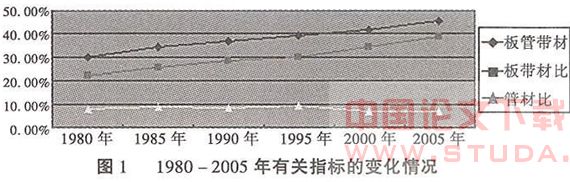 2.钢材出口结构不断改善,但高附加值产品缺乏竞争力。板管比是衡量钢铁产业产品结构的重要指标,在日本、美国、西欧、韩国等一些先进的产钢国家和地区,一般板管比已达60%以上,各种钢材中高附加价值产品也由20%左右发展到40%。相比之下,虽然随着我国钢铁产业的发展,其产品结构已得到日益改善(见图1),钢材出口结构也相应不断进步,其中1999年出口钢材中板材占55%,2000年出口钢材的板管比达到69.37%,出口板带比达58%,但在高附加价值产品方面与先进国家的差距仍是明显的。
