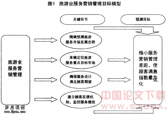 旅游业是一项综合性的服务产业,又是一个经济文化产业,属于第三产业的范畴。与此同时,服务营销管理是新兴起的管门类的一个学科分支,它源起于二战之后陆续进入服务经济社会的西方发达国家。旅游业作为服务业的主要行业之一,旅游业的营销管理属于服务营销管理的范畴。旅游市场服务营销管理目标模型的建立有助于对旅游服务市场进行全面综合地规划、预测、实施与监控,从而促进旅游经济的健康、良性发展。