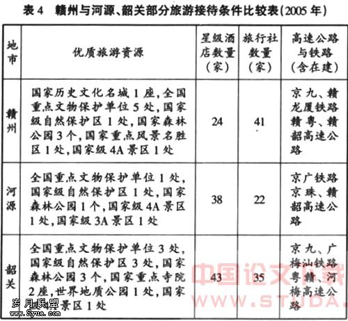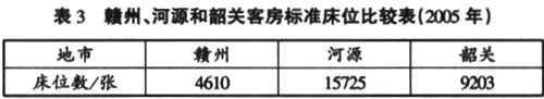 赣州并不是没有条件融入珠三角旅游圈,先看看表4赣州与河源、韶关部分旅游接待条件比较表:
