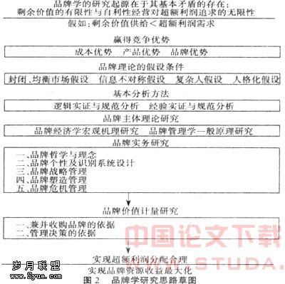 现在的品牌学理论基本上都来自案例分析,主要缺点在于研究结构的松散,其基本研究思路可以归纳为:以热点为研究起点,品牌认识的次序为研究逻辑,品牌现象为研究对象,用创新概念这样的方法和途径,解释现实品牌现象发生发展的,其基本研究框架就是从不同角度对品牌各种不完整的认识。也有少量的文章对品牌学的基本结构做过简述,但都是按照现象发展层次进行的逐层剖析,所得结论大多无从证明,其过程也缺乏严谨的分析。