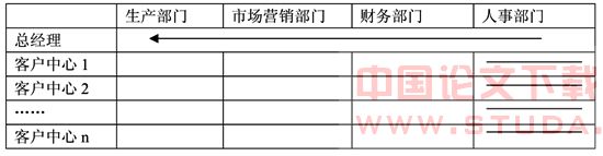 这种结构说明,每个客户中心经理对总经理负责,而每个职能部门也直接对总经理负责。客户中心经理的主要职责是整合和协调。而各个职能部门负责人则是负责对于部门内部行政的管理。的资源按照客户进行配置。但是人力资源是由公司统一管理。划箭头的一行表示在职能部门中专门针对总经理服务的,对于所有客户部门的一种宏观上的管理的一个小组。它对各个客户中心的职能行为进行监控并且将各个部门的业绩最终加总。?