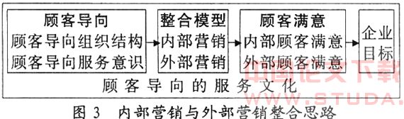 (3)内部营销与外部营销是企业整体营销的组成部分。如图1所示内部营销和外部营销是企业整体营销战略不可缺少的组成部分,没有外部营销指导的内部营销是不切实际的,没有内部营销支持的外部营销也是不能成功的。