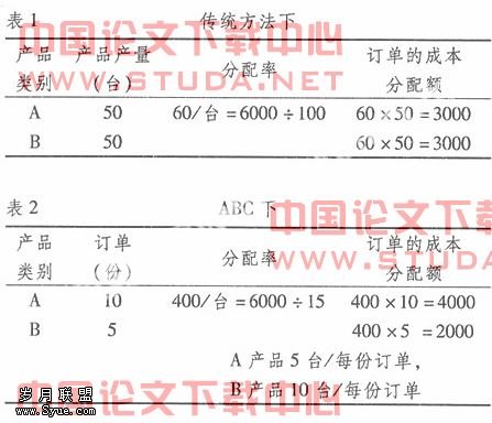 当应该选用非单位层次的成本驱动却没有这样做时,就会造成较大的产品成本失真误差。例如:某工厂生产A、B两种产品,发生的与订单相关的辅助作业成本是6 000元,处理每份订单所需要的资源是相等的。若按传统方法归集成本如表1,若按非单位层次的订单批量归集如表2。对比后发现,通过非单位层次的作业归集费用后,这家工厂不同的产品成本发生了很大的变化,管理者就可以据此作出正确的生产和经营决策。