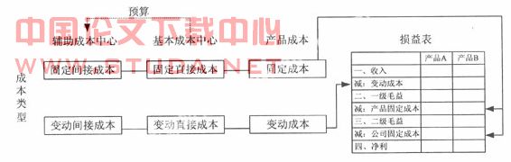 4.分层分类损益表。GPK下编制的损益表有两个特点,第一是分层级,每一个产品的收入减去变动成本得到一级贡献边际,接着从一级贡献边际中减去适当的固定费用,不同的边际贡献可以在不同的层次上得到。[3]具体把贡献毛益分成多少级,要因企业的规模及其组织机构设计而定。小企业可以少设层级,大企业因其组织机构复杂应多设层级,以便对各层级机构进行考核。第二是分产品,把用于产品的资源成本向各组产品分摊,使负责人能够知道每一种产品的边际成本和每一组产品的财务业绩(见图1)。