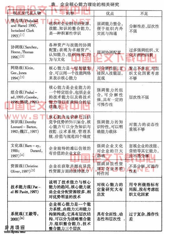 20世纪90年代以来,企业核心能力理论的研究一直是企业管理理论研究的一个热点问题。本文追踪国内外的研究成果,并在此基础上进行了深入的分析探讨,得出了一些结论(如表所示)。