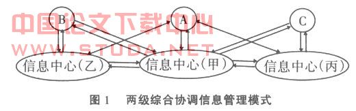 4.两级综合协调信息管理模式。由于各企业一般采用信息集中管理方式,各部门都是与该企业信息中心进行信息传递。企业与供应链中其他企业的信息传递主要由信息中心负责控制,部门也可以直接访问其他企业信息中心,比如查询产品信息,同时为保证整个供应链中信息的一直性和完整性,通常由核心企业的信息中心负责整个供应链信息流管理,即充当供应链信息交换中心角色,由它控制上下游的信息传递(如图1)。图中甲、乙、丙为三个企业,甲为核心企业,A、B、C分别为甲、乙、丙的部门,单向箭头表示信息流,双向箭头表示信息流及其控制。 该信息管理模式特点有:(1)具有一定的分散管理的灵活性,信息能够比较及时地沟通,同时又具有集中管理的宏观协调能力,信息集中统一管理,提高了信息的一致性和共享性,形成完整协调的供应链信息流,使供应链管理效率得以显著提高。(2)供应链管理实际上是一种群体决策机制,物流、信息流应同步处理并且能够顺畅、快捷的流动。这一信息管理方式,能使人在正确的时间和地点以正确的方式获得信息和物质,从而保证了供应链的效率。(3)核心承担了较多的信息管理工作,付出了更多的成本,而且,核心企业可能出于自私利益的考虑和信息管理技术和能力的不足,使供应链信息风险增加。