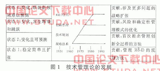 技术是社会进步的主要动力之一。随着技术的迅速发展,技术的发展呈现了三个明显的特点:①技术研究开发的投入无论从单位投入还是从总体规模而言都呈现递增趋势;②从技术发明到其商业化应用的周期越来越短;③技术在现代增长中的贡献度增大。同时,所处的宏观与微观经济环境已发生巨大变化使得技术管理所处的环境由单一、稳定变得复杂多变。新技术的开发应用风险提高并且不易被人们所了解和管理(Bhattacherjee, 1998)。因此,技术管理工作变得越来越重要,重视和加强技术管理成为当代经济社会发展的一大趋势(匡跃平,2000,李志军,1998)。自19世纪70年代产生以来,技术管理已经过了近三十余年的发展,该领域内对其发展历程的分析角度也不尽相同。本文通过研究发现,对技术管理发展历程的分析主要分为基于学派演化和管理理论演化两个角度。