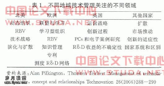 Alan Pilkington、Thorsten Teichert认为目前最严重的问题之一是缺乏对技术管理内容的一致理解并对技术管理进行统一的定义。造成这一结果的主要原因是研究机构地理分布的不同,导致各个研究机构的研究重点不同(如表1)。且彼此之间交流有限,从而阻碍了技术管理作为一个纵向学科发展,并使得其边界模糊。同时,研究者并不把自己的研究成果发表在自己领域的出版物上也是重要原因之一。?