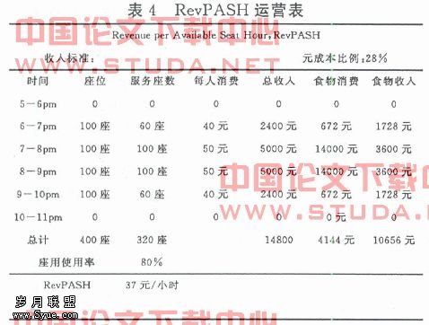 如表四所示,在晚上6-7pm没有任何营业收入,当到9-10pm达到高峰时期,如果该餐饮企业6-7pm、9-10pm两时段一般为40座/时,那么该餐饮企业可获得400个可用座/时的280个入座/时。为了吸引更多的客人提前或延后入座,就必须利用的时间敏感度,使用预定技术来提高低谷期的入座数,如果餐厅的客户通常只花费平均每人50元,餐饮企业在保证二个高峰时段的收入时,则分流每入座20座/时到低谷6-7pm、9-10pm两时段,可以提高低谷时的销售量40元,那么该餐饮企业可得到额外40座/小时×40元=1600元,因此如果你能通过时间敏感性来分流让一些客人早到或延迟入店,所得的潜在收益是相当可观的;如果能提高高峰时段的翻台率(例如,一小时内,100座能达到120人入座)那么总量上提高了总入座数,这样弥补了低谷时段的低入座数。运用RevPASH分析得知,若低谷时段,上座数仅为40座,则即使70%的入座率的情况下,总收入为,RevPASH=13200/400=33元/小时,则收入与37元/小时比较则大为减少,因此对于一个餐饮企业经营者而言,通过分析RevPASH得出必须提高服务员的业务技能水平,改进服务的流程以及合理的菜单设计来缩短客人的停留时间。?