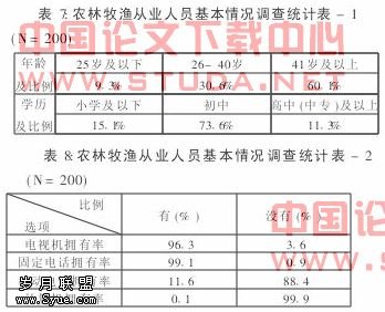 2004年12月,我们进行了第三次抽样调查,主要针对农、林、牧、渔从业人员,调查的主要内容是信息技能与信息需求,获取有效样本200个。调查内容涉及拥有的电视、电脑、固定电话、移动电话、学历、人均收入、信息需求内容、获取信息渠道等等,调查结果见表7~8。