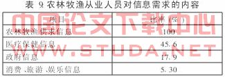 而四川乡镇农村从业人员的信息需求内容有别于城市人口,他们更多地关心农林牧渔方面的供求信息,因为这是关系到自身生存的大事情,其具体情况见表9: