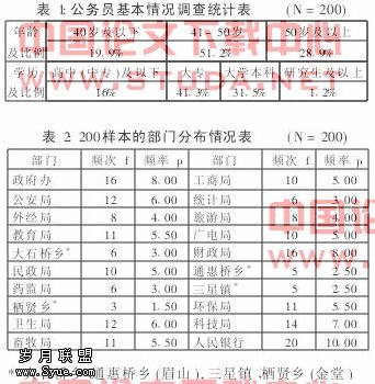 四川省县乡(镇)政府信息的提供方式及提供的运行环境究竟是怎样的?政府公务员对政府信息的共享意识又如何?带着这些问题,我们于2004年8月对四川省的眉山、成都等地的县和(乡)镇的48个政府部门进行了随机抽样调查,通过实地访谈、发放调查问卷等方式,获得了200个样本的第一手资料。样本中男性65%,女性35%,所在部门涉及政府办、工商局、公安局、外经局、统计局等部门及部分乡镇,分布较为广泛,调查的内容包括公务员的年龄组成,政府部门提供信息的存贮格式、网络运行的环境及对信息共享的认识、评价等等,表1为接受调查的公务员的基本情况,表2为调查样本的分布情况。[3]
