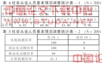 2004年10月,我们进行了第二次抽样调查,即对两县城(包括乡镇)里的非社会从业人员进行了关于信息技能与信息需求的调查。调查总人数200个,其中男性占66%,女性占34%。调查者的职业分布是:教师占10·5%,学生占9·4%,商业服务业从业人员占59·6%,其他占20·5%。调查内容涉及拥有的电视、电脑、固定电话、移动电话、学历、人均收入、信息需求内容、获取信息的渠道等等,以此来推断其信息技能和信息需求。调查的基本情况见表4~5。调查显示,在四川县乡(镇)的非农村人口中,人均月收入集中在500—1000元之间的占32·5%, 500元以下的约占26·1%,在这种情况下,电视机和固定电话的普及率均为100%,由于经济条件的制约,个人拥有计算机的比率较低(21·3% ),但随着社会的发展和个人收入的不断增加,这种比率在稳步提高。受信息时代的影响,没有计算机的人往往会选择在单位或去网吧上网交流、获取信息。