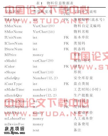 1、物料信息是统一记录物料的各种属性.包括本身基本信息、与仓库有关信息、与工艺有关信息。统一记录与管理物料信息有利于保证数据的统一与完整性在设计物料信息的数据结构时要考虑物料的物理信息(实际的)和逻辑信息(为控制物料而设定的)。它的数据表如表1所示