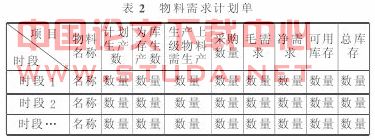 物料需求计划单是提供某个计划的各个时段用到的或产出的所有物料的供求情况。它是用物料清单展开来每时段的每种物料的平-衡.是计算的结果(表2)。