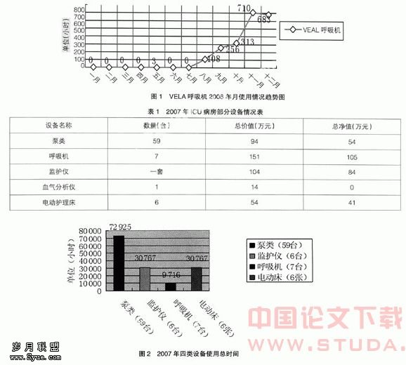 为此,器械科把固定资产分成收益性和非收益性两大类。对收益性固定资产按照设备使用的次数来进行设备有效性分析,督促使用科室尽快收回成本;对非收益性固定资产严格管理,防止流失。笔者以2007年ICU病房的部分设备使用情况为例进行分析: